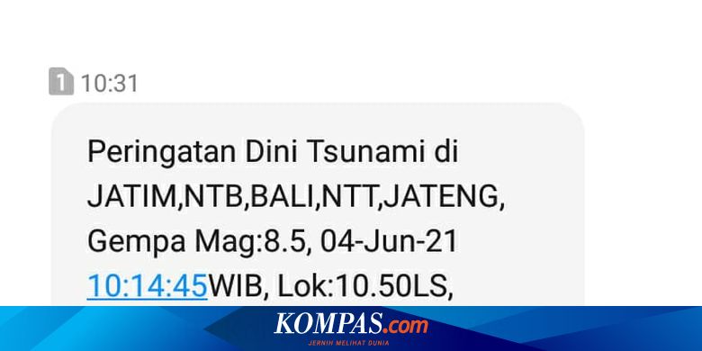 "Peringatan Dini Tsunami di JATIM NTB BALI NTT JATENG Gempa Mag:8.5 04-Jun-21 10:14:45WIB Lok:10.50LS 114.80BT Kdlmn:10Km::BMKG," berikut bunyi pesan singkat yang juga diterima Kompas.com itu.