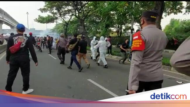 Massa tiba-tiba datang dari arah Pulogadung, Jakarta Timur. Polisi kemudian mencoba menghalau massa dengan mengedepankan pasukan ber-hazmat.