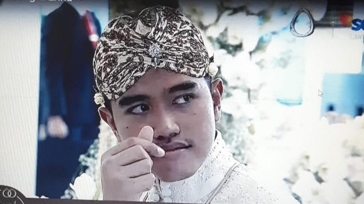 Presiden Jokowi dan Ibu Iriana terlihat mendampingi sang putra untuk duduk di tempat ijab kabul. Kaesang Pangarep terlihat tersenyum sumringah saat diapit orangtuanya.