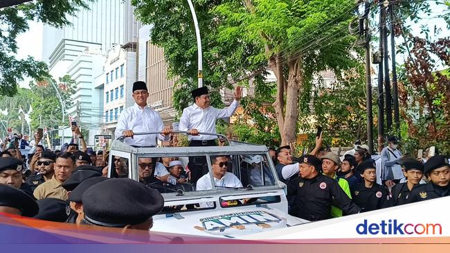 Anies dan Cak Imin menaiki Land Rover menuju KPU RI saat hendak mendaftar capres dan cawapres. Pagi tadi, Anies dan Imin kompak mengenakan kemeja putih dan peci berwarna hitam dengan atap terbuka Land Rover.